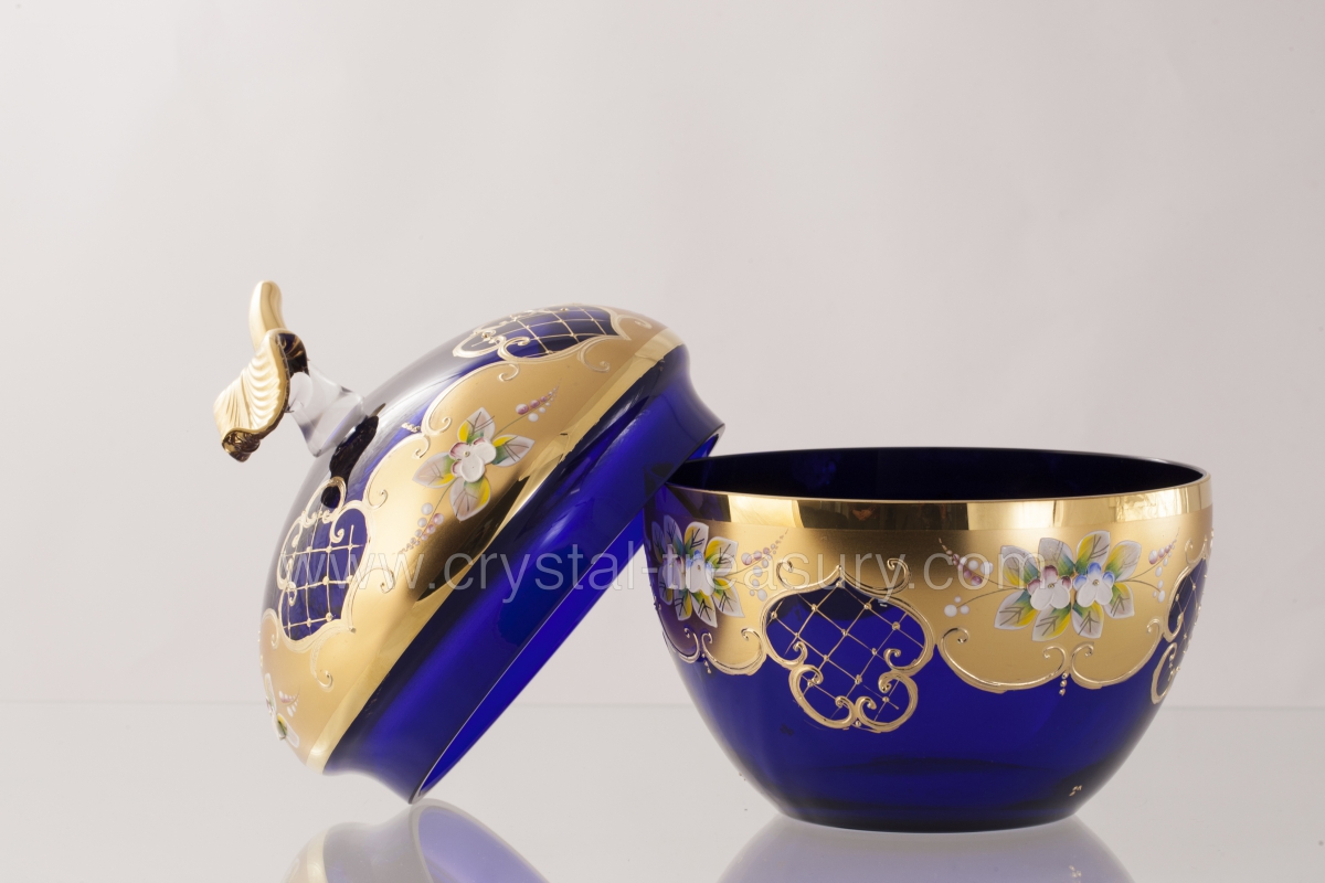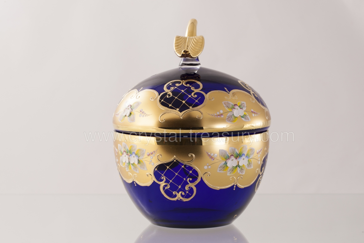 Bohemian blue glass box with lid, in the shape of apple. Hand-painted and decorated with gold and high enamel. Product from Czech Republic.