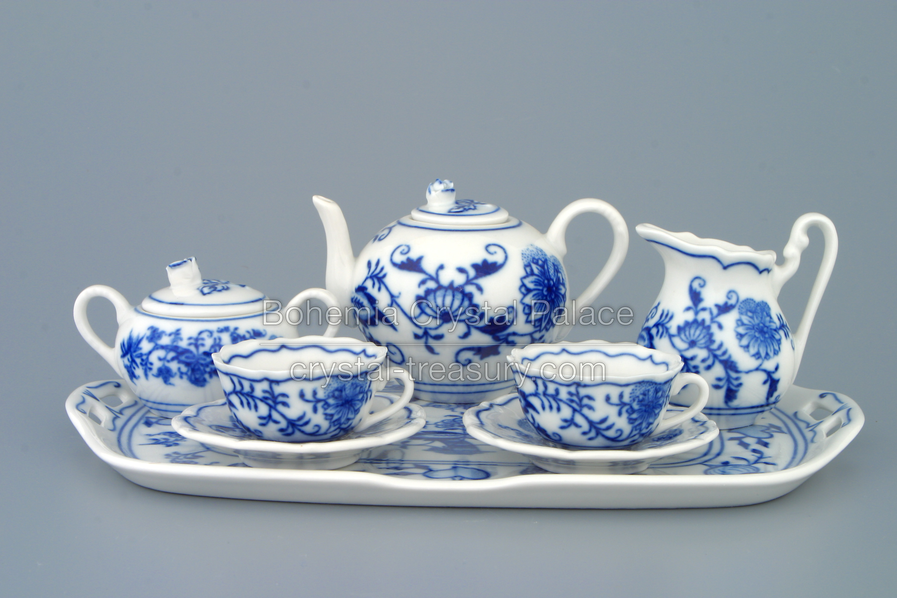 Zwiebelmuster Tea set for two people. Tea pot, creamer, sugar bow and two cups with saucers and a tray.