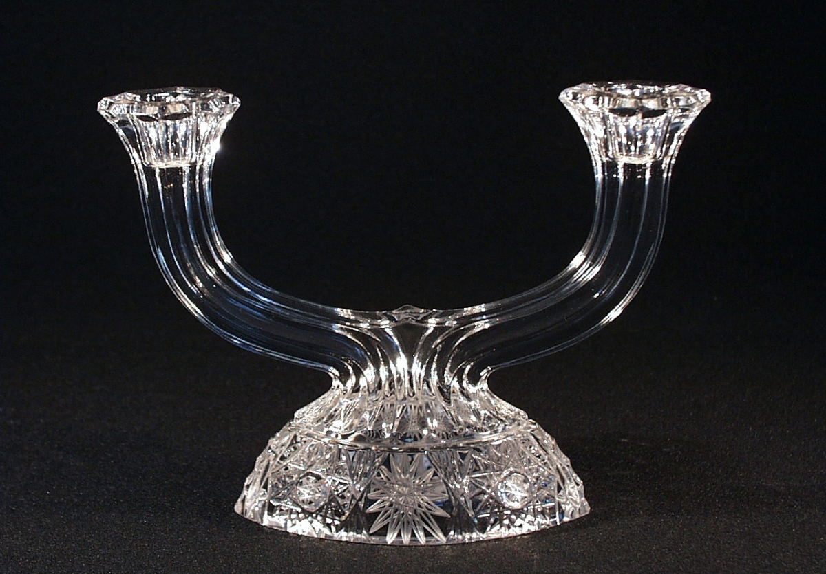 U-shaped cut crystal candlestick with two arms. Top quality, hand-made full lead Bohemia crystal, pressed on manual press.