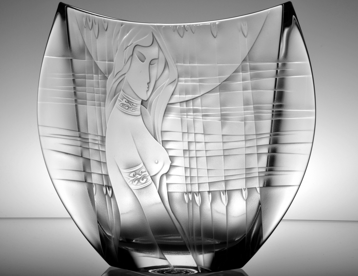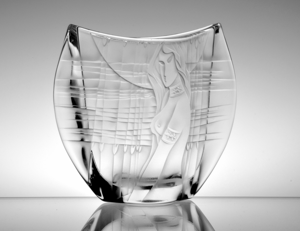 Crystal vase with sandblasted art decor. Hand-made, polished.