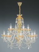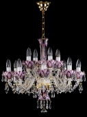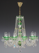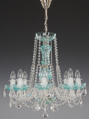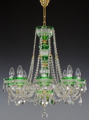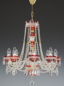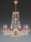 Cased crystal means that layer of clear crystal is cased in colored crystal, which produces a two-tiered effect. The outer layer of colored crystal is grounded away in patterns, which let the inner clear crystal shine through. This is a very demanding process, and these chandeliers are thus slightly more expensive.