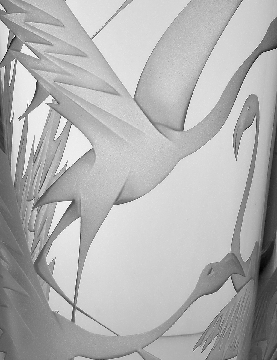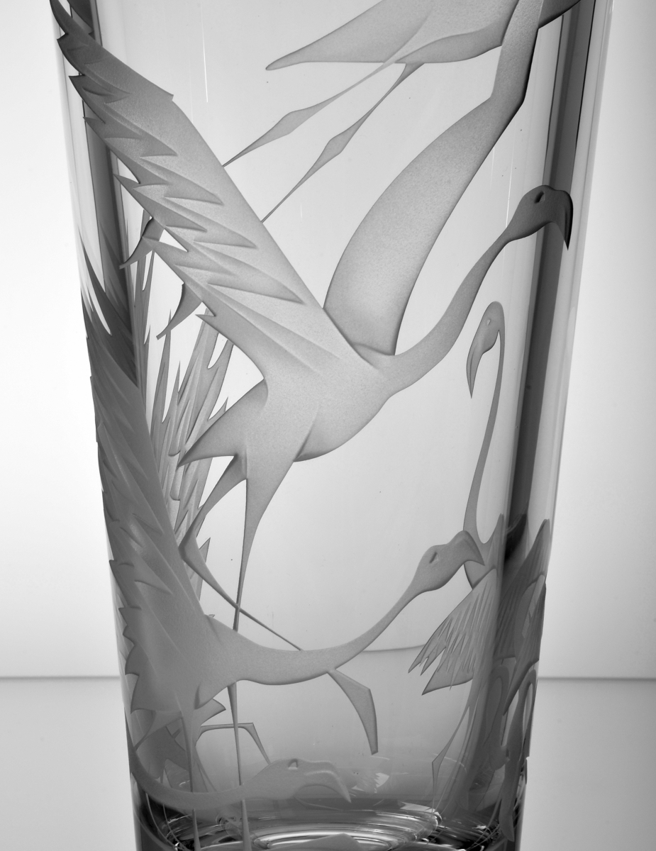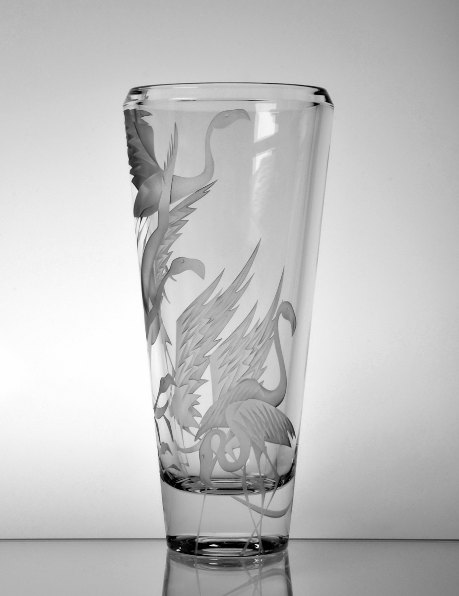 Multi-motion flamingo take-off. Very beautiful decoration, deep sandblasted into crystal vase. Bohemia crystalite.