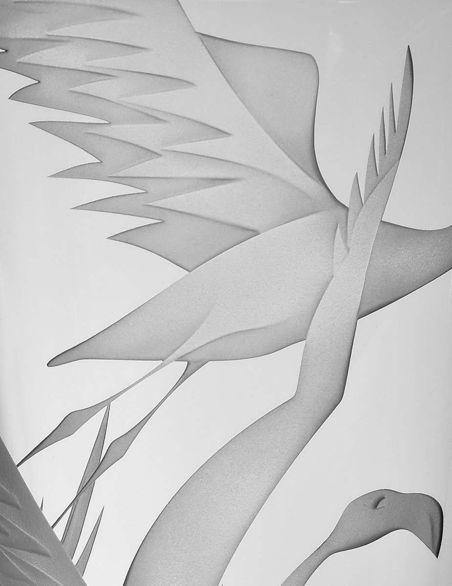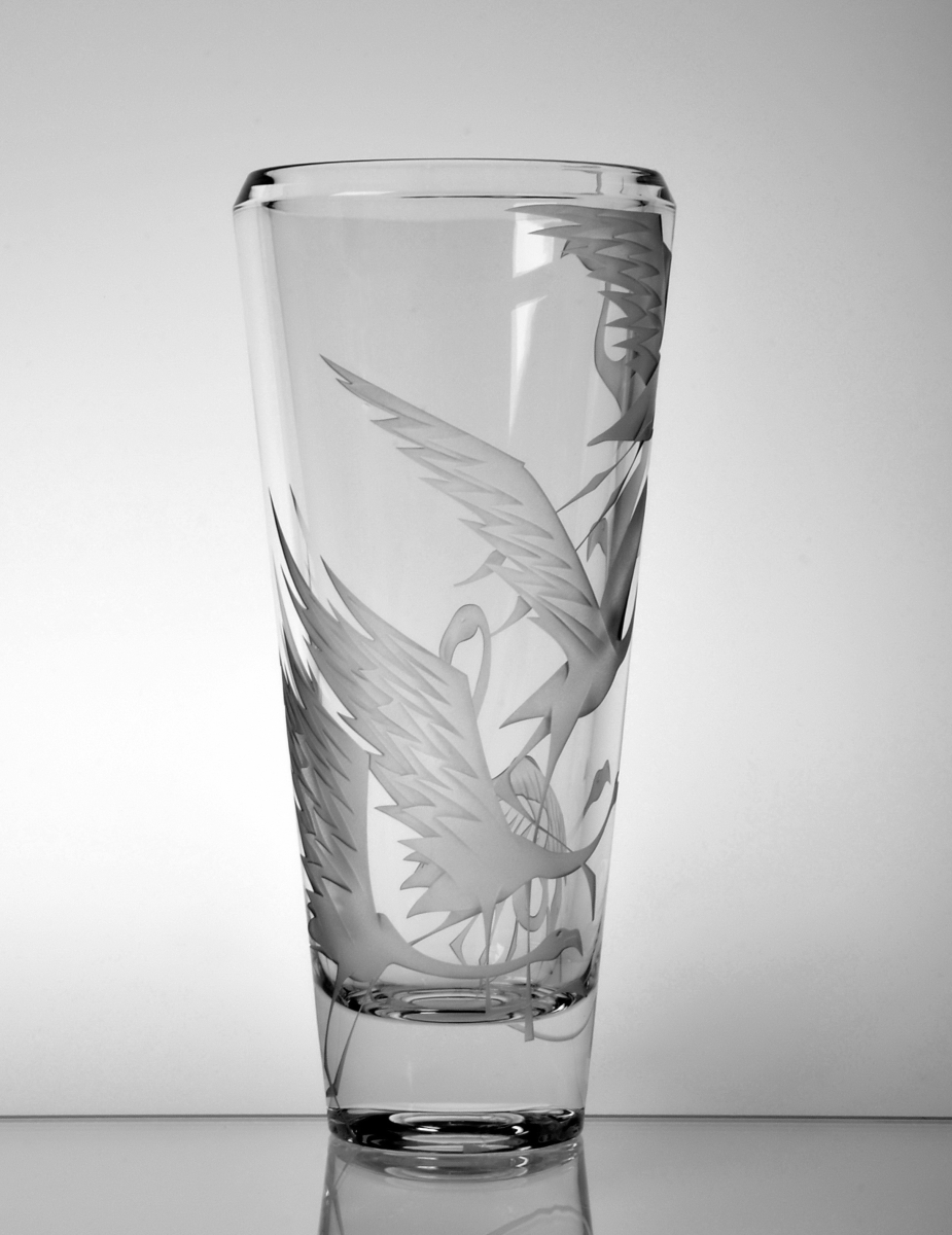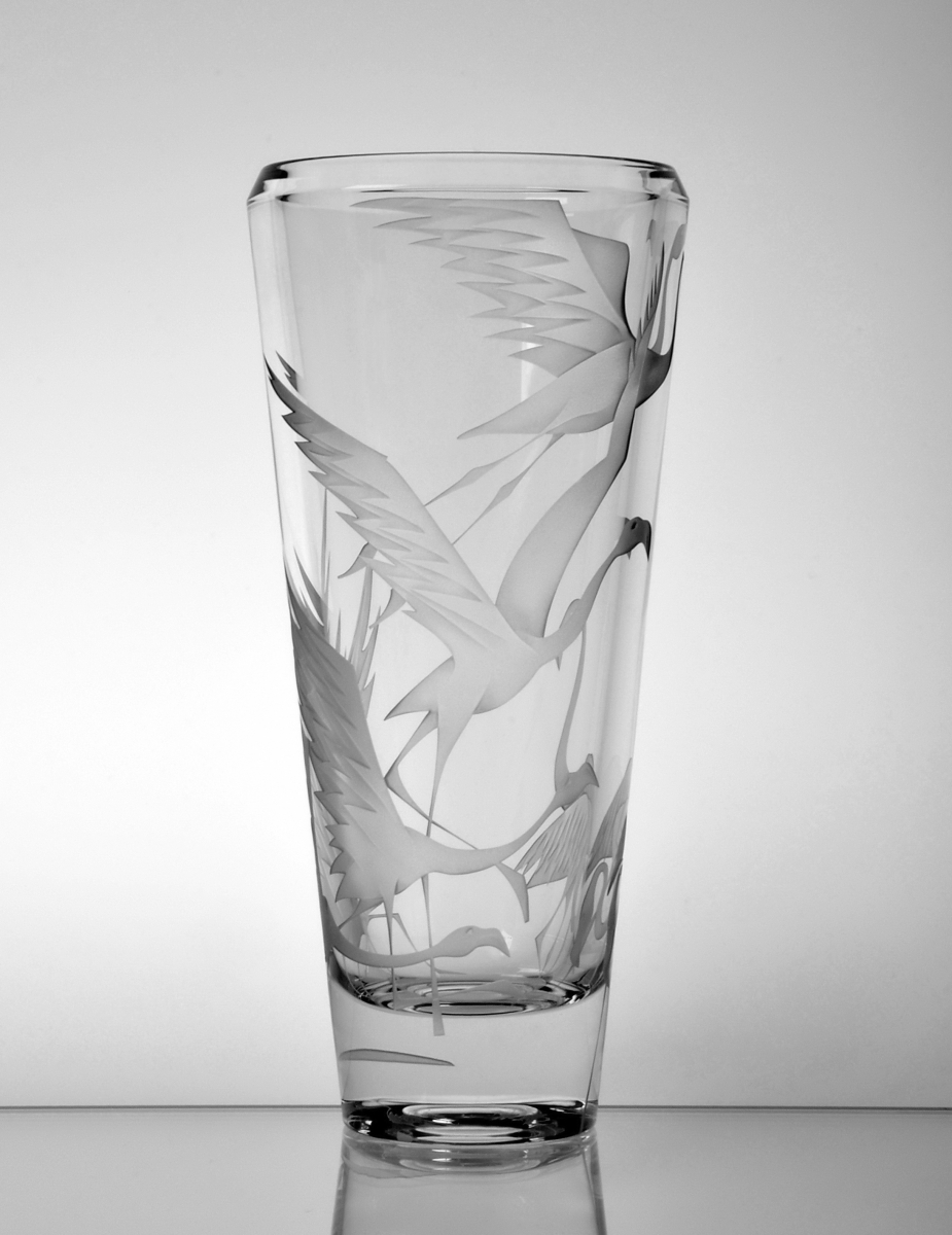 Multi-motion flamingo take-off. Very beautiful decoration, deep sandblasted into crystal vase. Bohemia crystalite.