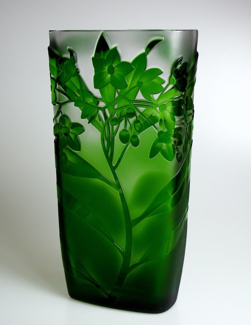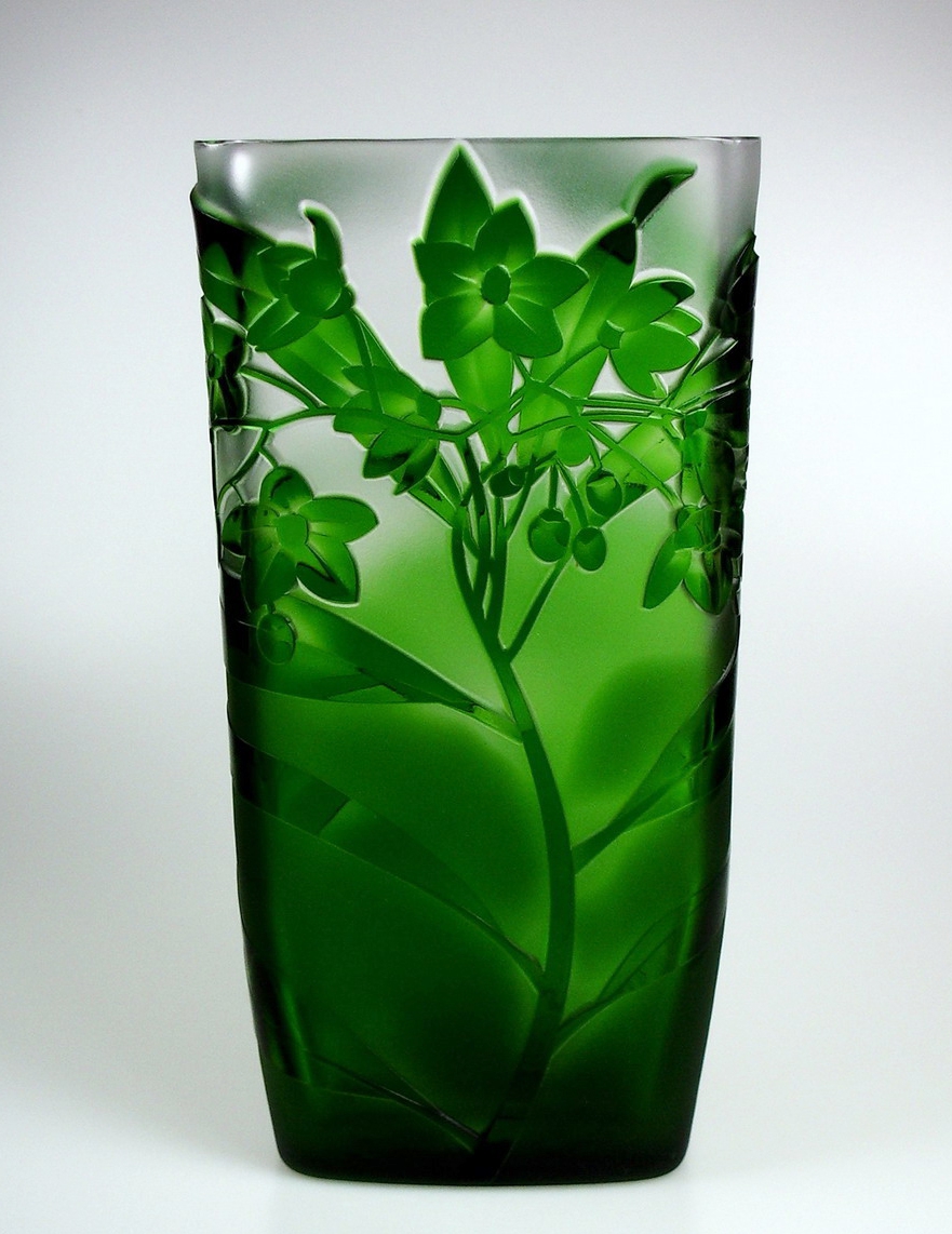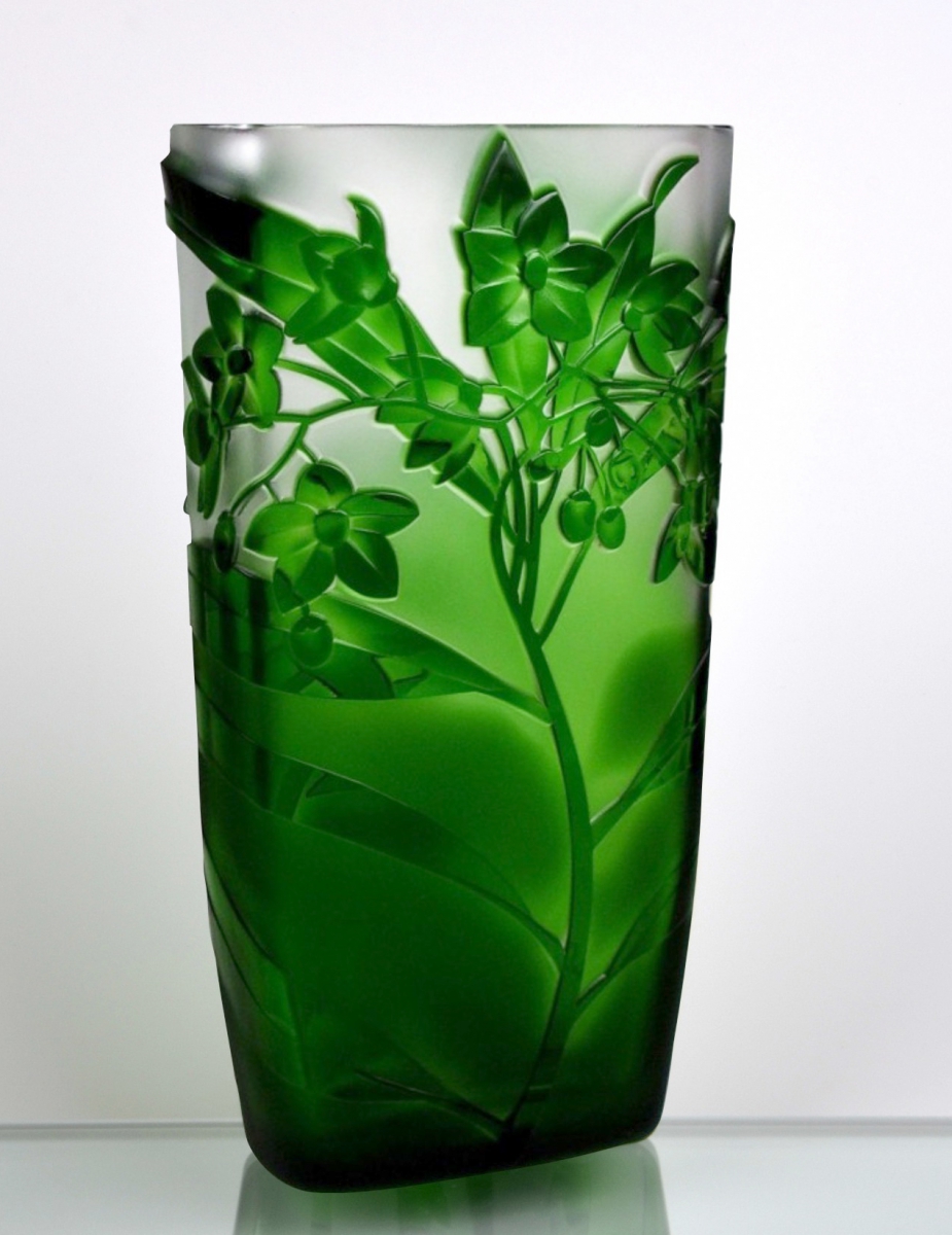 Angular crystal vase with Solanum plant sandblasted decor. Very detailed, elaborate flower design and decent green color. Hand-made cased green and clear Bohemia crystal. Hand-made. 50 pcs limited series.