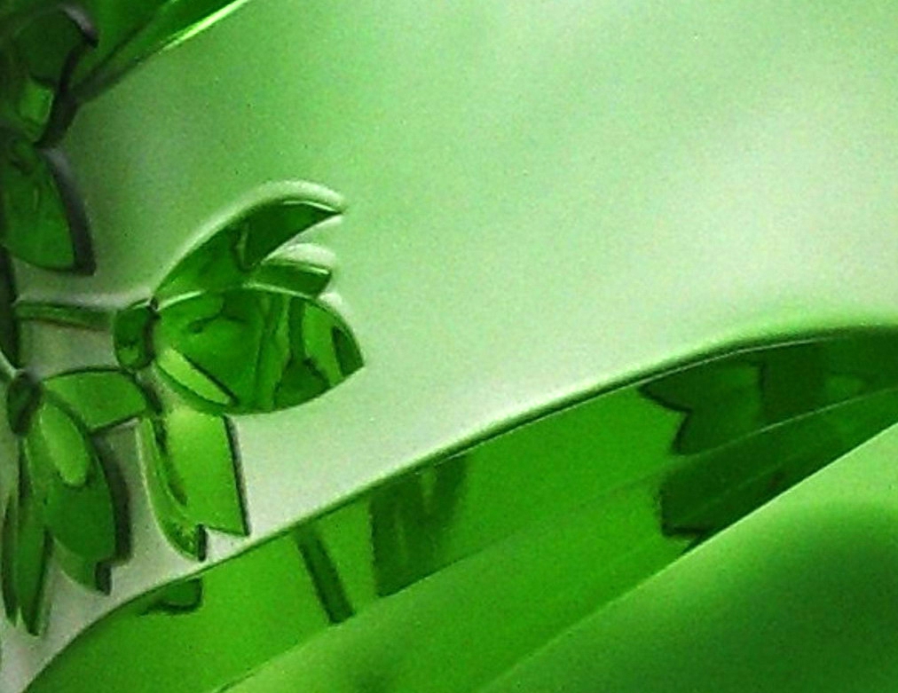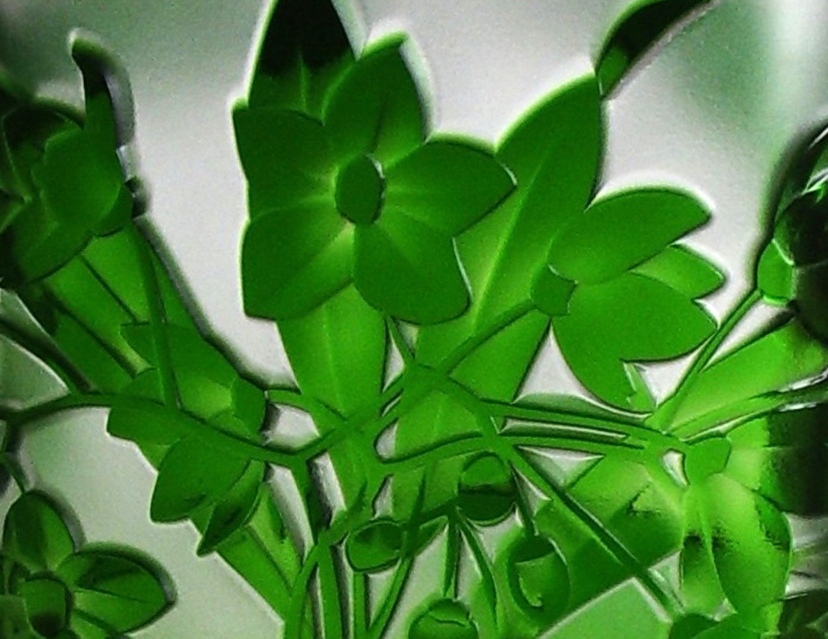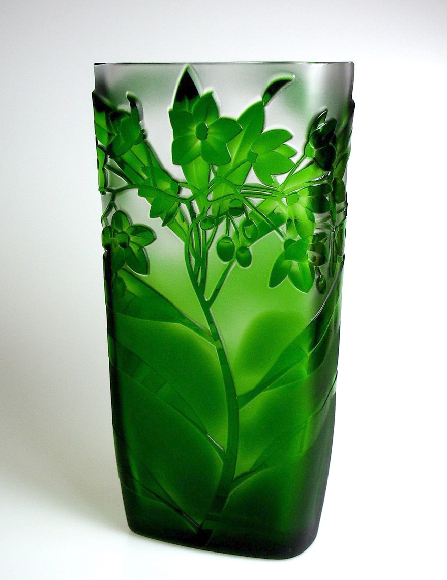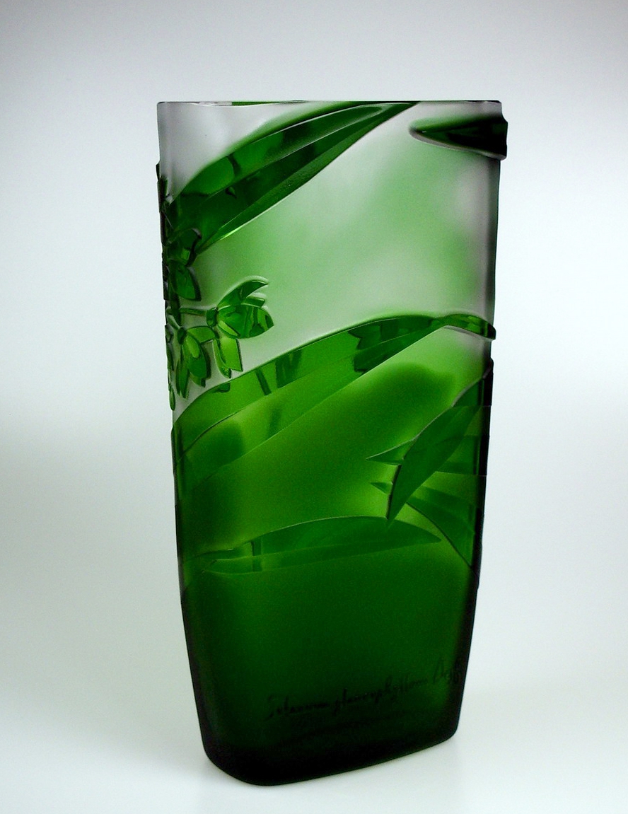 Angular crystal vase with Solanum plant sandblasted decor. Very detailed, elaborate flower design and decent green color. Hand-made cased green and clear Bohemia crystal. Hand-made. 50 pcs limited series.