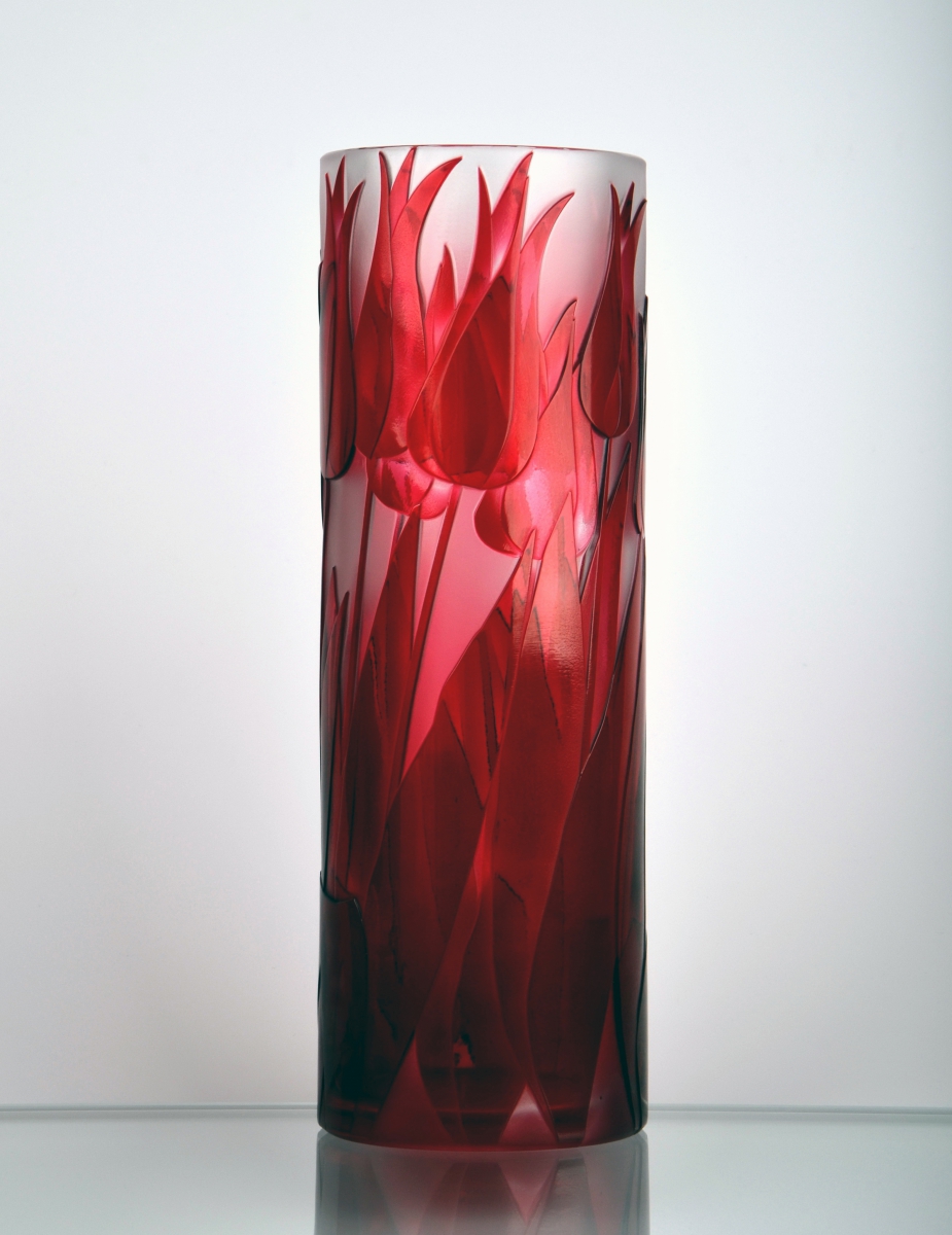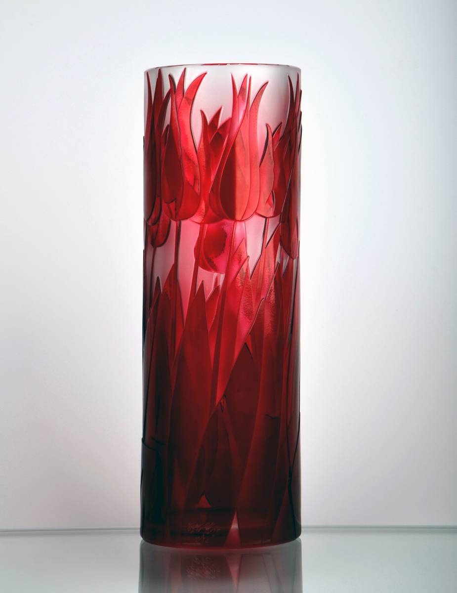 Beautiful tulip shapes encourage to be stylized and sandblasted in red and clear crystal. Hand-made cylindrical vase, 50 pcs limited series.