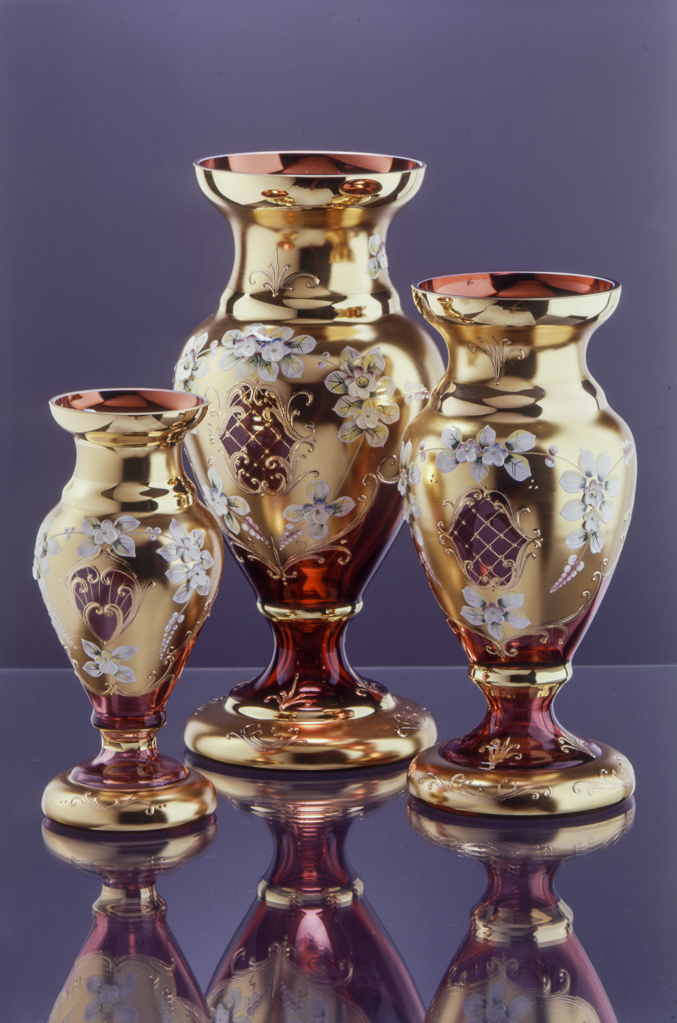 Váza Srdcovka, dekorovaná vysokým smaltem a tekutým zlatem, vypálená v peci pro zajištění odolnosti dekorace. Krásná ruční práce.