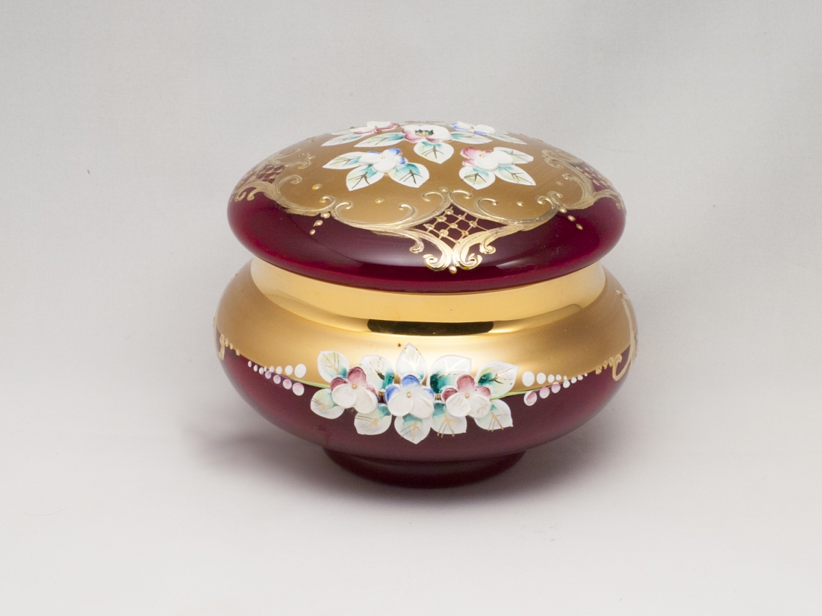 Dóza s víčkem kruhového půdorysu, ručně malovaná zlatem a vysokým smaltem.
