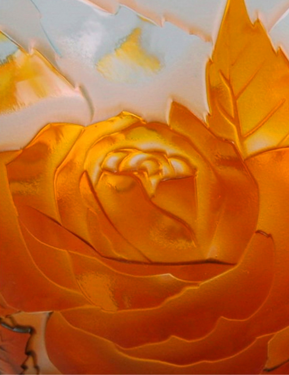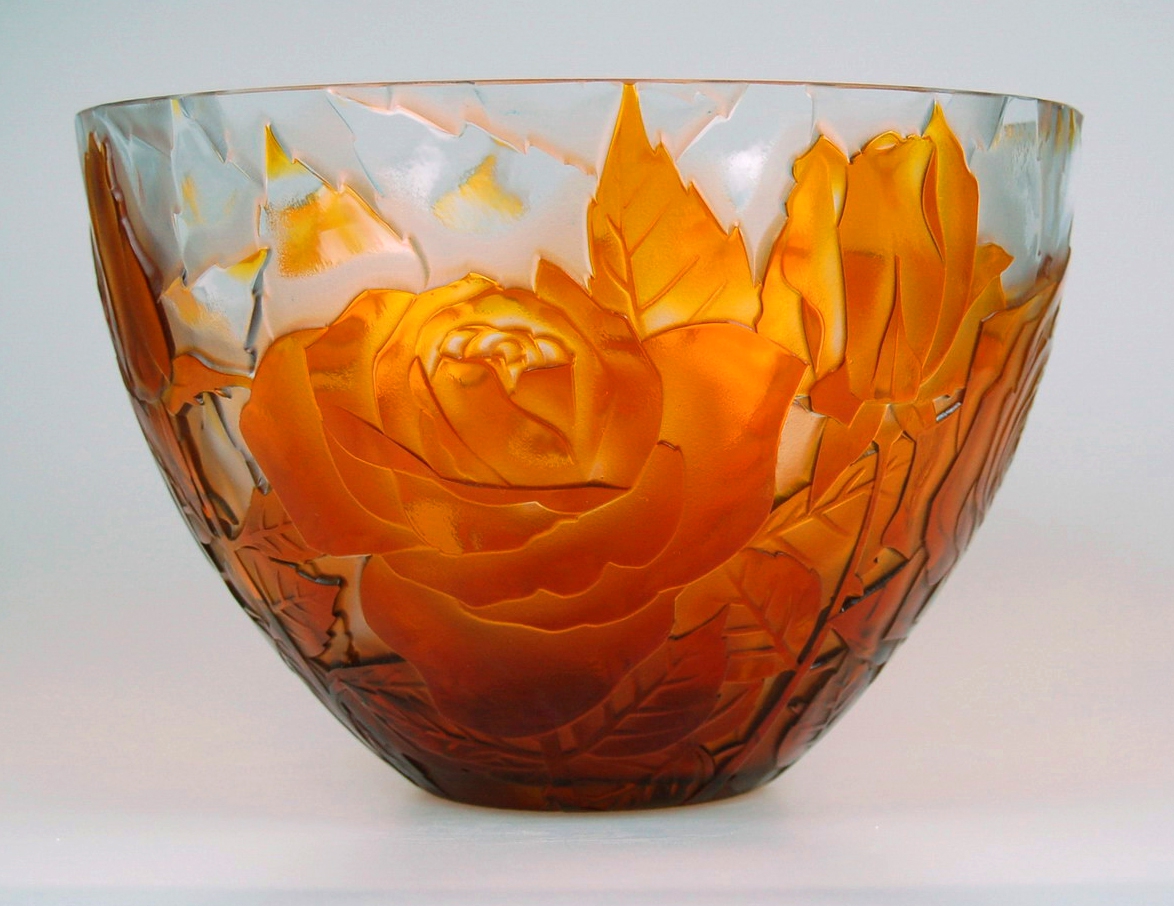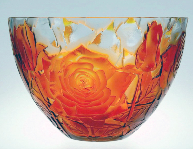 Nádherný dekor růže vyniká také v ambrové barvě. Celkový dojem podtrhuje tvar mísy s širokým okrajem. Mísa ruční přejímaný křišťál, pískovaná. Limitovaná série.