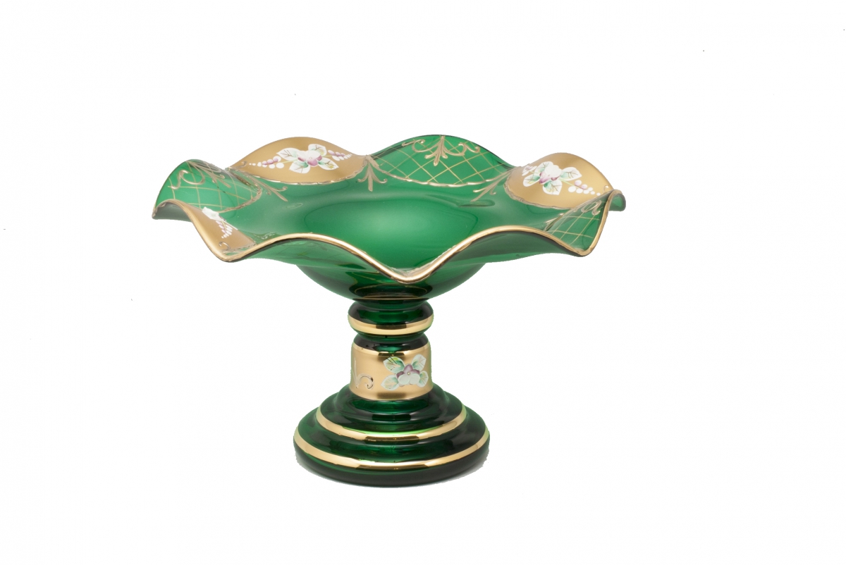 Skleněný zelený nástolec lipnovaný, vysoký smalt a zlato s přetahem. Ruční práce.