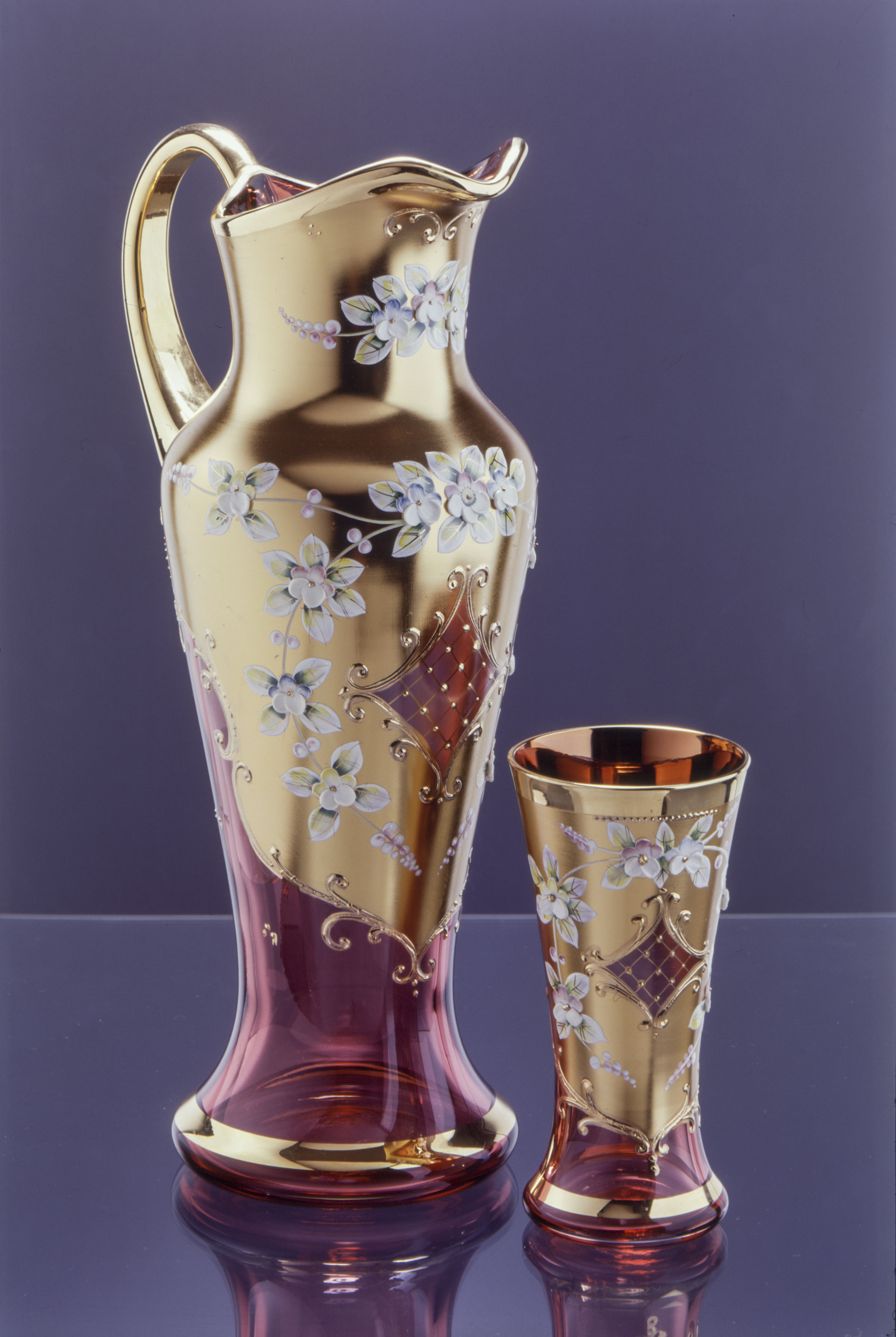 Sedmidílná souprava na vodu či pivo, obsahující džbán a šest odlivek. Dekorace zlato a vysoký smalt. Tradiční česká výroba. Barva: červeň Zlatá Róza.