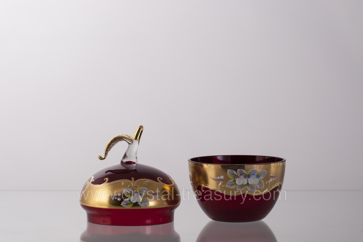 Vysoký smalt kombinovaný s malbou zlatem na červeném skle.