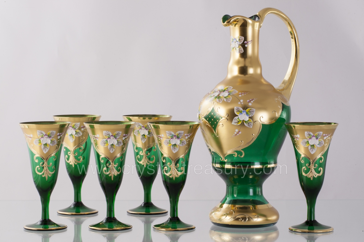Sedmidílná souprava na víno - džbán se šesti kalíšky na noze. Hutně tavené barevné sklo, ručně dekorované matným zlatem a vysokým smaltem.