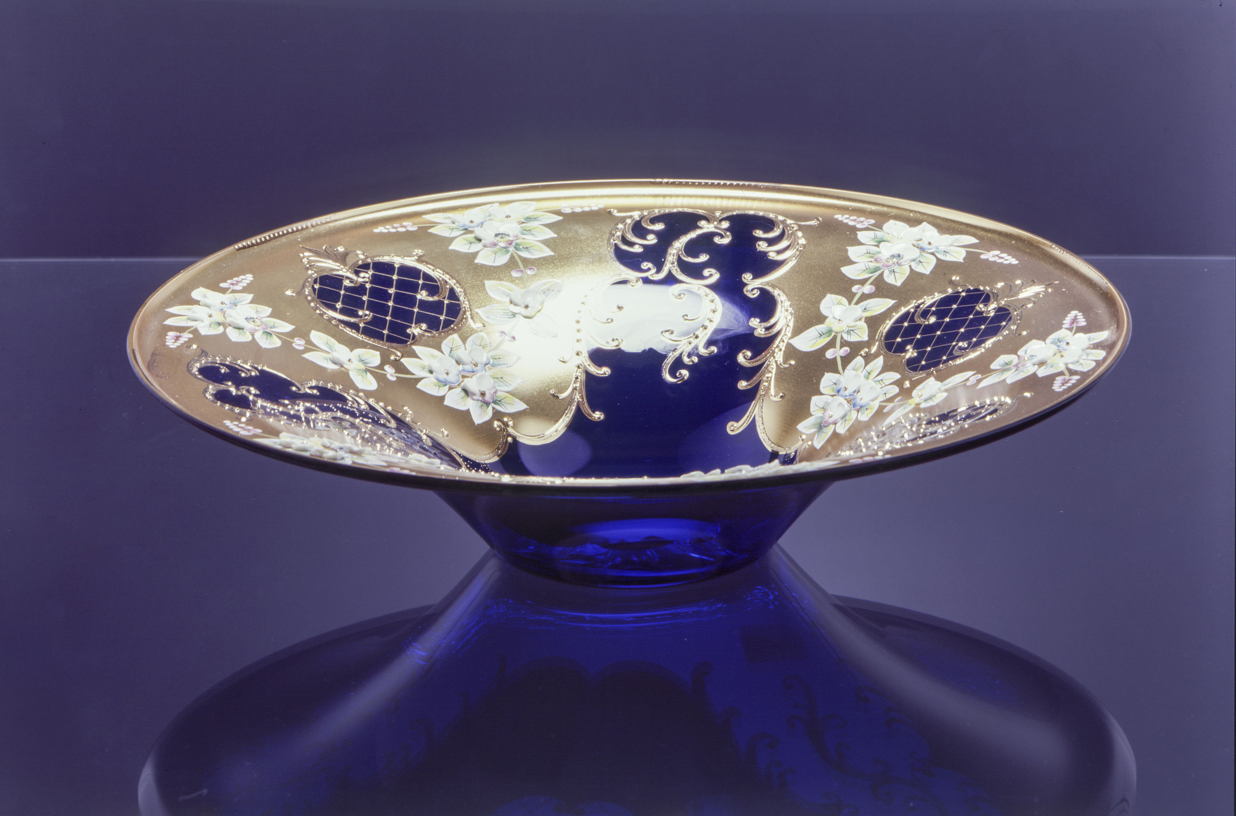 Ozdobný dekorativní talíř, který může sloužit i svému praktickému účelu. Tradiční ručně nanášený vysoký smalt a zlato s přetahem.