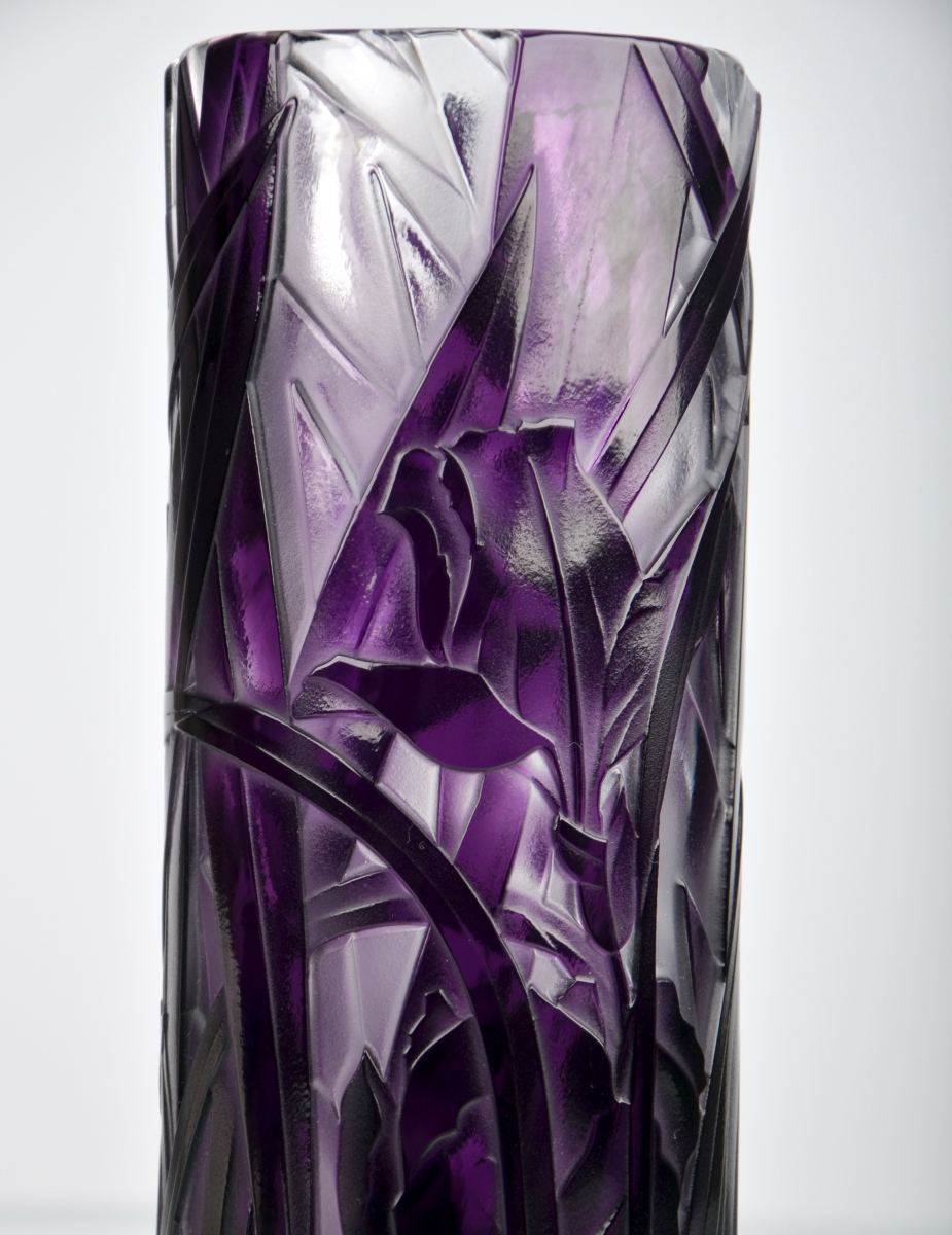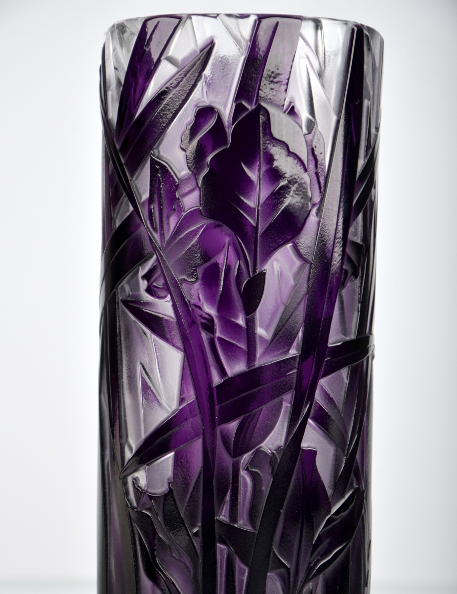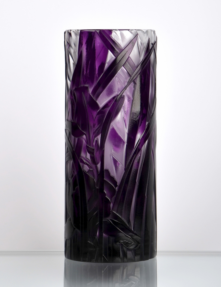 Noblesně působící válcová váza s detailně propracovaným květem Kosatce ve fialové barvě. Ruční přejímaný křišťál, pískovaný. Limitovaná série.