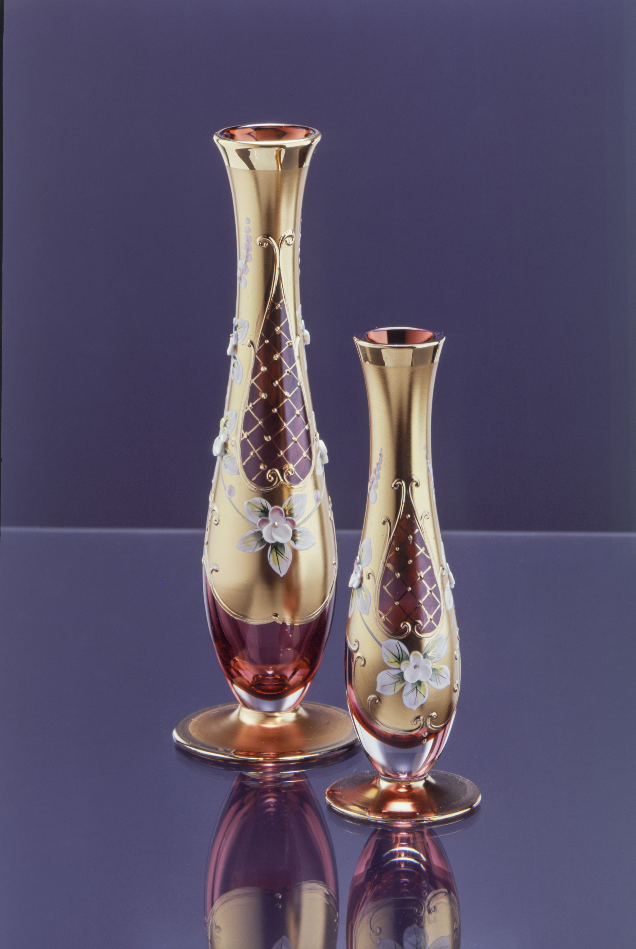 Smaltovaná vázička vhodná jako dekorace či pro jednu menší květinu. Tradiční výrobek českých skláren. Malovaná tekutým zlatem.