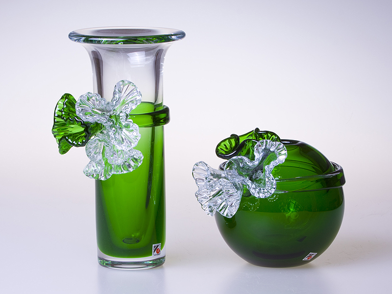 Vaza zelena a kristal, s nalepem kvetinoveho dekory. Rucni prace.