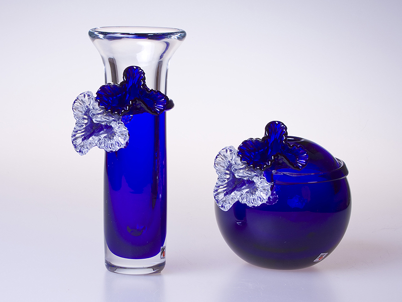 Blue and crystal glass vase, with the hot-shaped flower decoration. Hand-made in Bohemia.