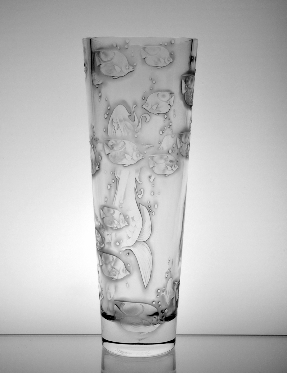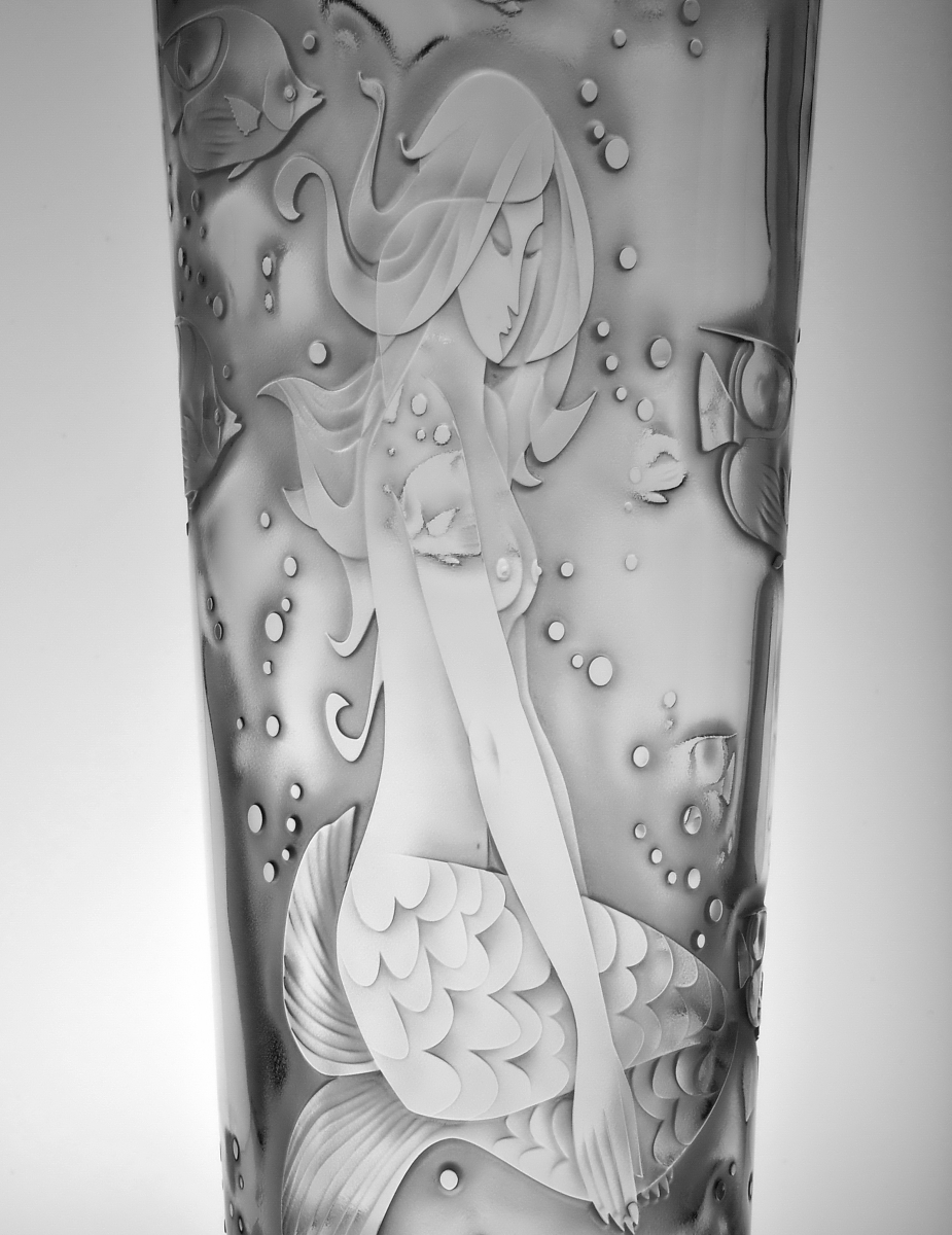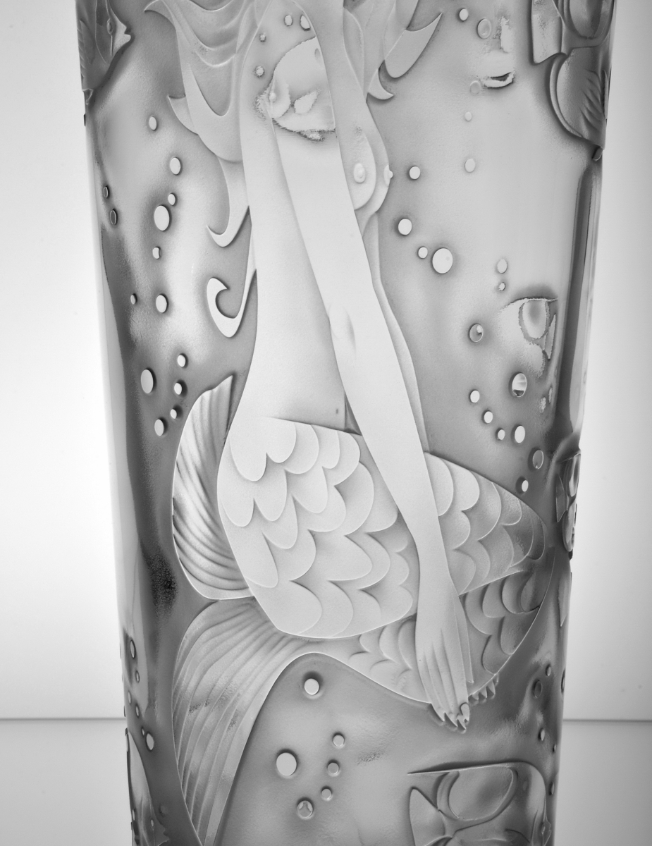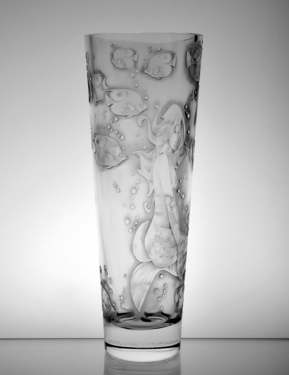 Crystal vase decorated with sandblasted mythological composition of woman's body and beautiful underwater world. Limited crystal series.
