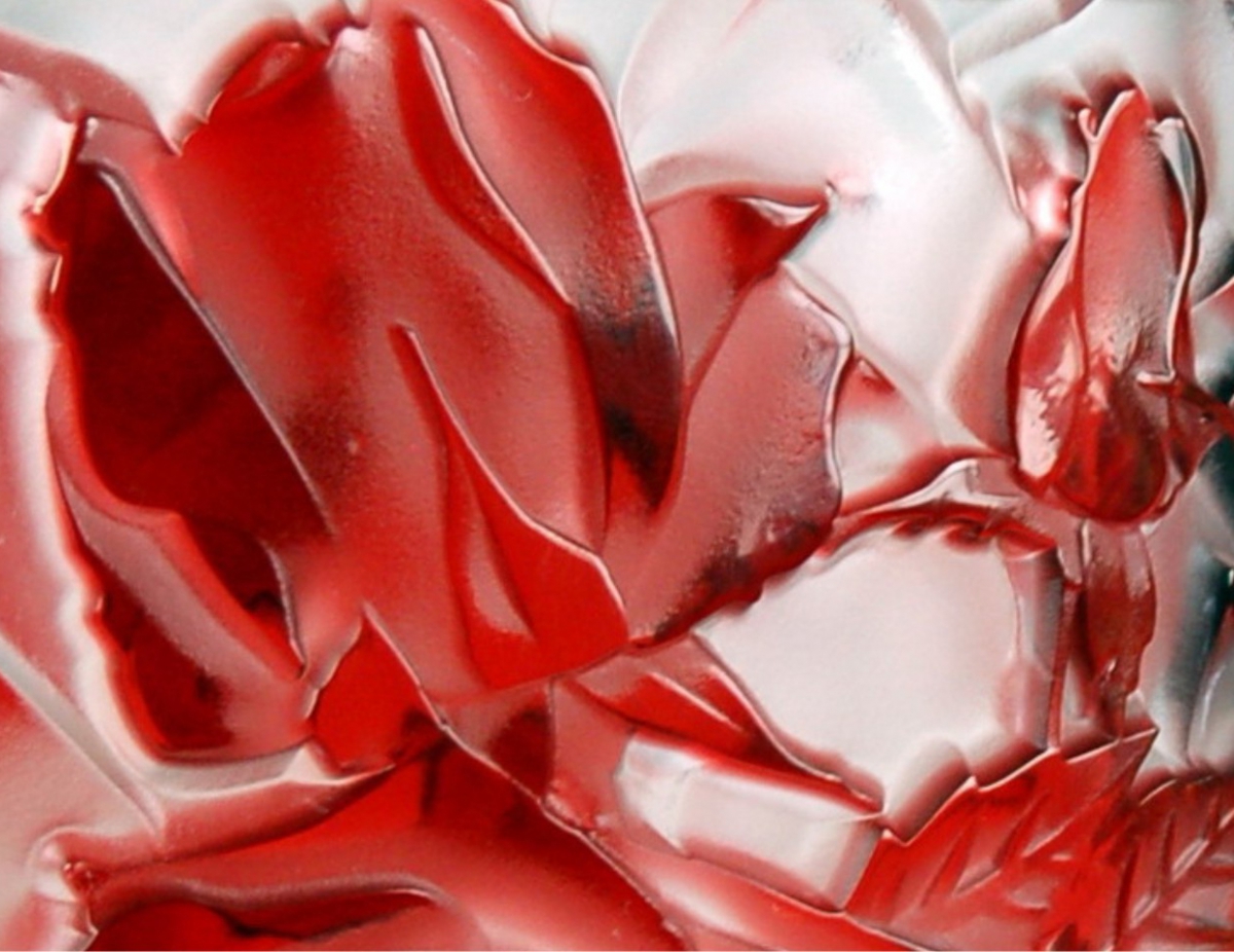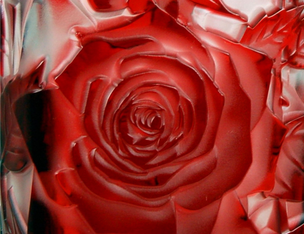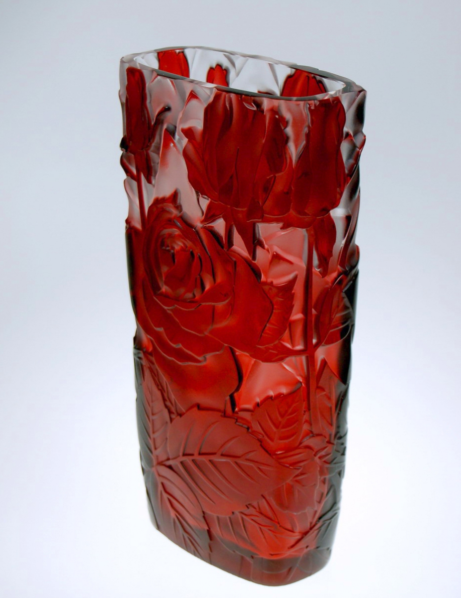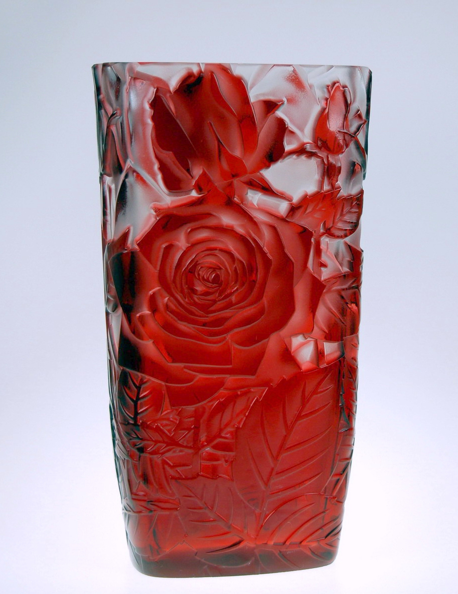 Angular cased red crystal vase with sandblasted roses decor. Realistically modelled, shines on this large, angular vase. Hand-made, sandblasted and polished. Bohemia Crystalite. 10 pcs limited series.