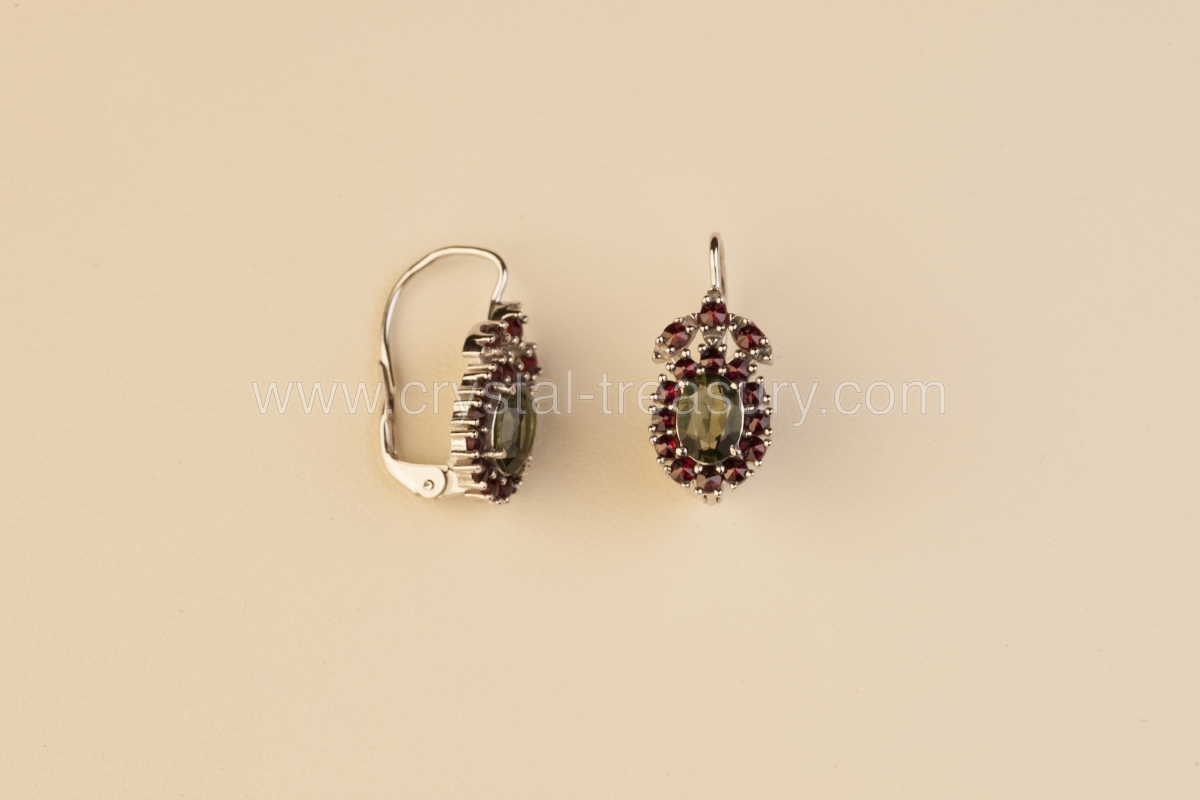 Small earrings combining unique, green Vltavin stone and red garnet. Both stones can only be found in the Czech Republic. Size 1,5 cm.
