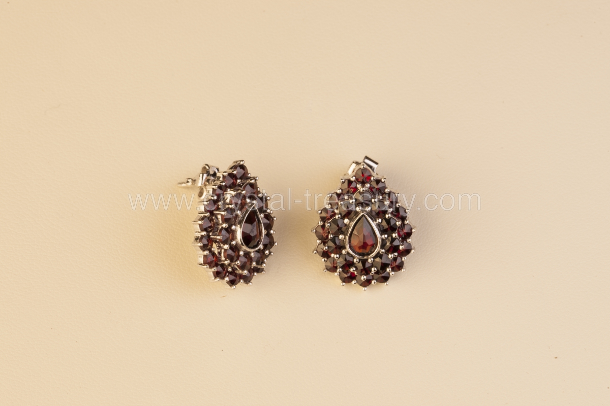 Small earrings, with small garnet stones and one large, in the shape of a drop in the middle. Earrings are 1,9 cm long.
