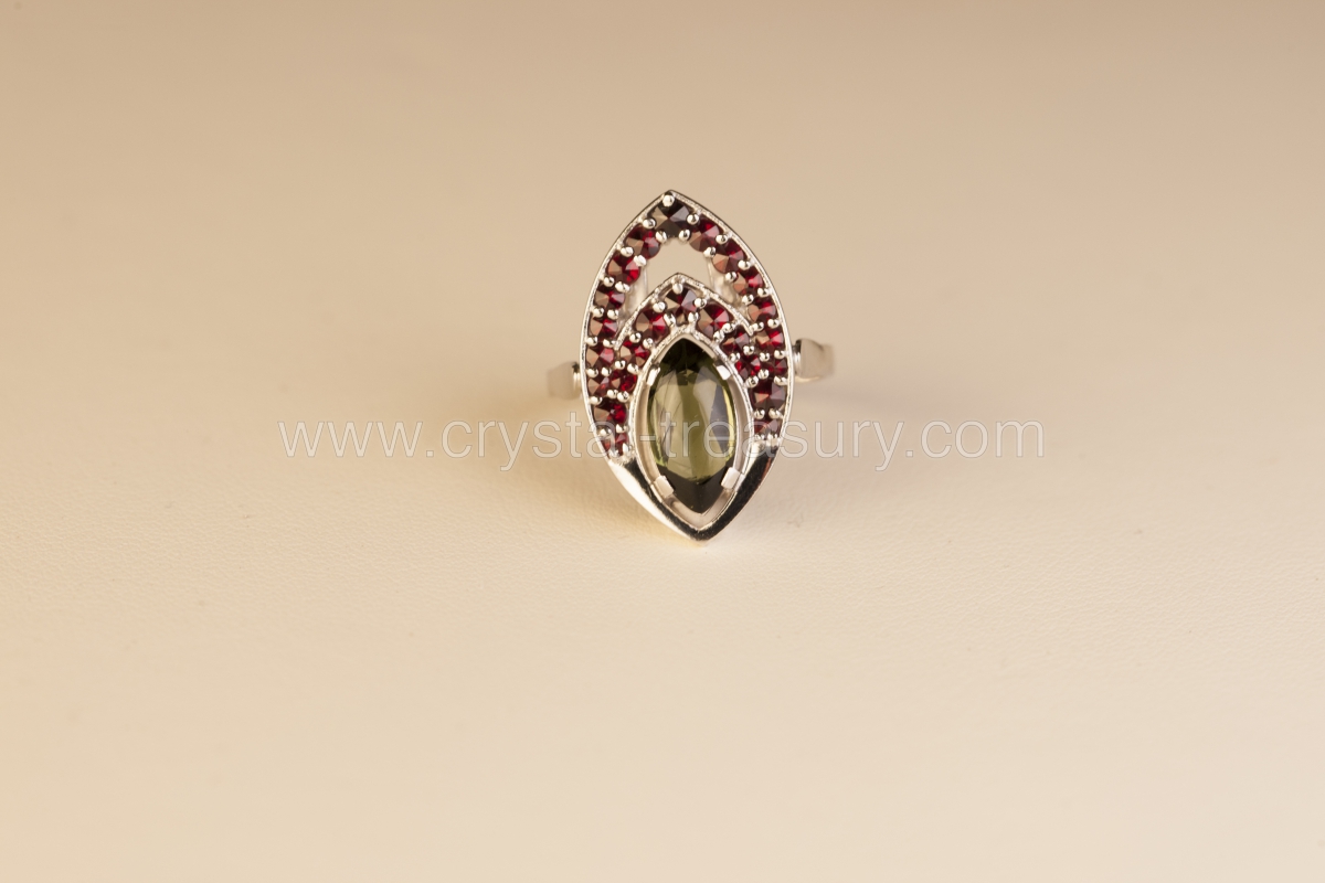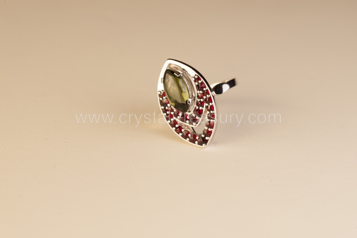 Garnet earrings in the shape of the leave, combining typical Czech garnets with another famous Czech stone, green Vltavin. 2,5 cm long.