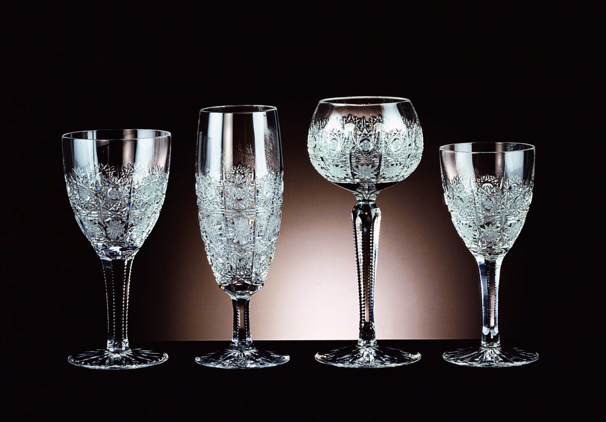 Traditional Bohemia hand-cut crystal stemware from Czech Republic. From left to right: Large wine glass, beer glass, tall goblet, small glass.