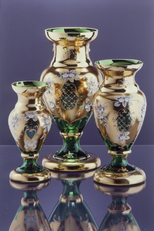 Raised high enamel vase. Bohemia glass, green color. Hand made with care.