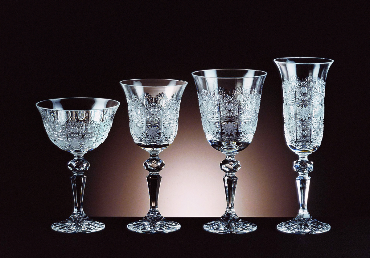 Laura crystal glassware from left to right: Champagne saucer, small wine, water goblet and champagne flute. Height - 20cm/7.87", Top diameter - 7cm/2.75"