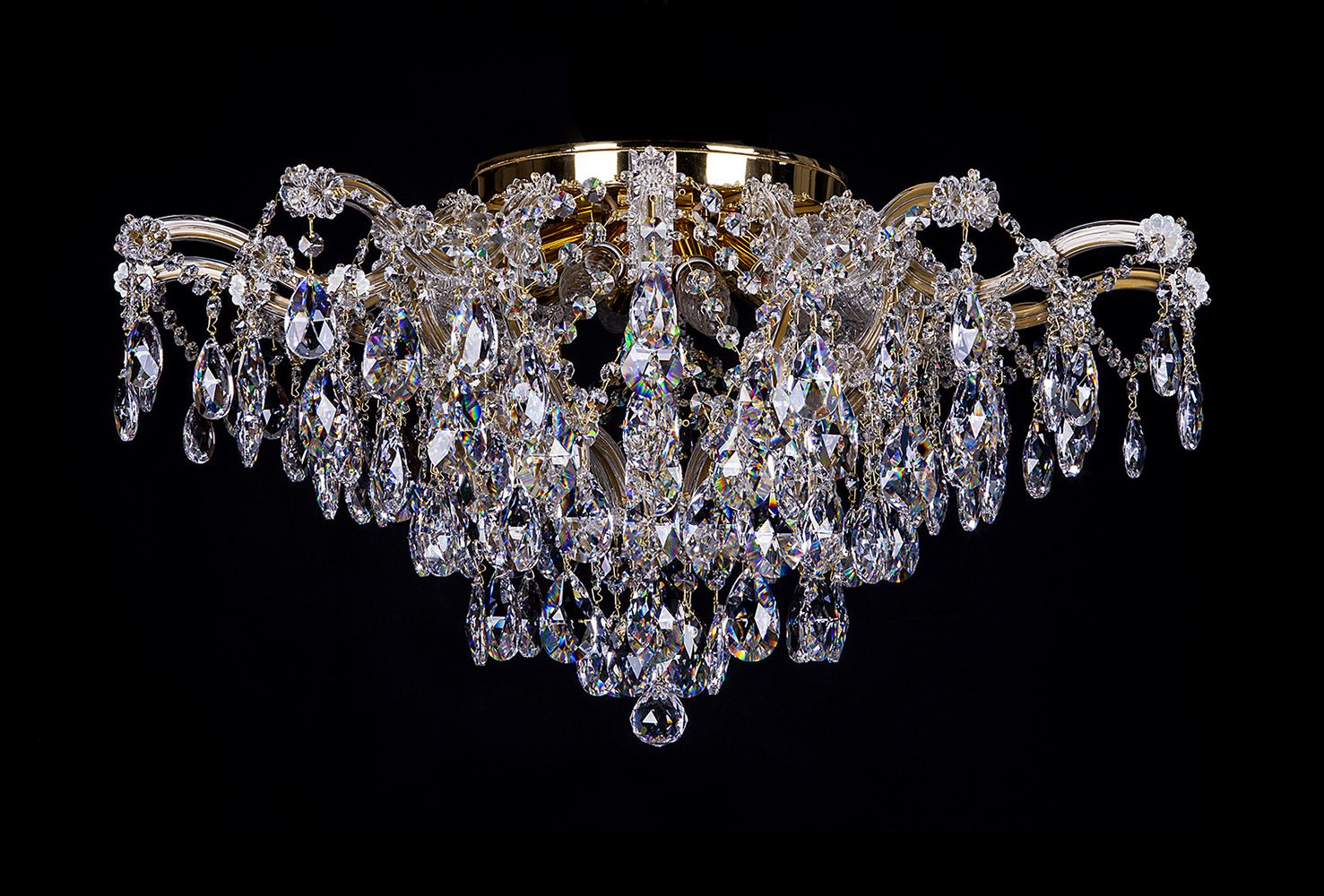 This chandelier has no chain, and is great for low ceilings, as it is attached directly to the ceiling. 12 x 40W bulbs, strong metal arms clad in crystal.