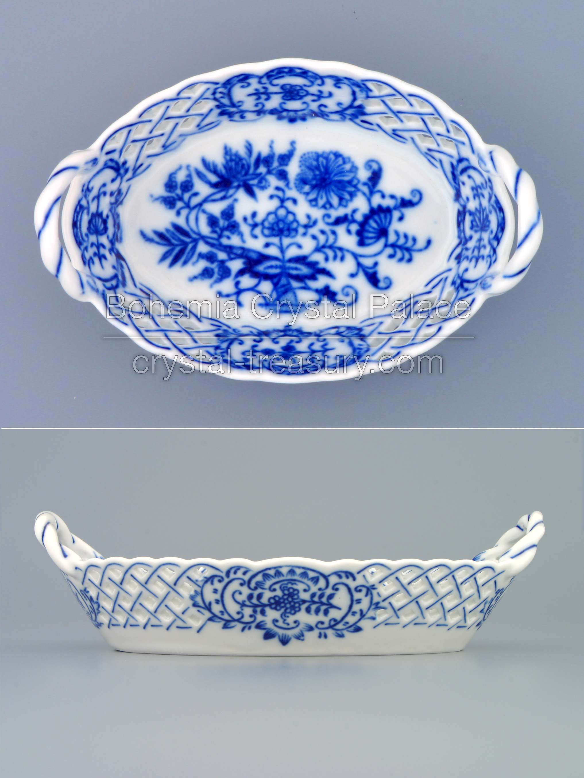 Czech Porcelain Oval Bowl With Handles further decorated with perforations. Original Zwiebelmuster, Blue Onion decor.