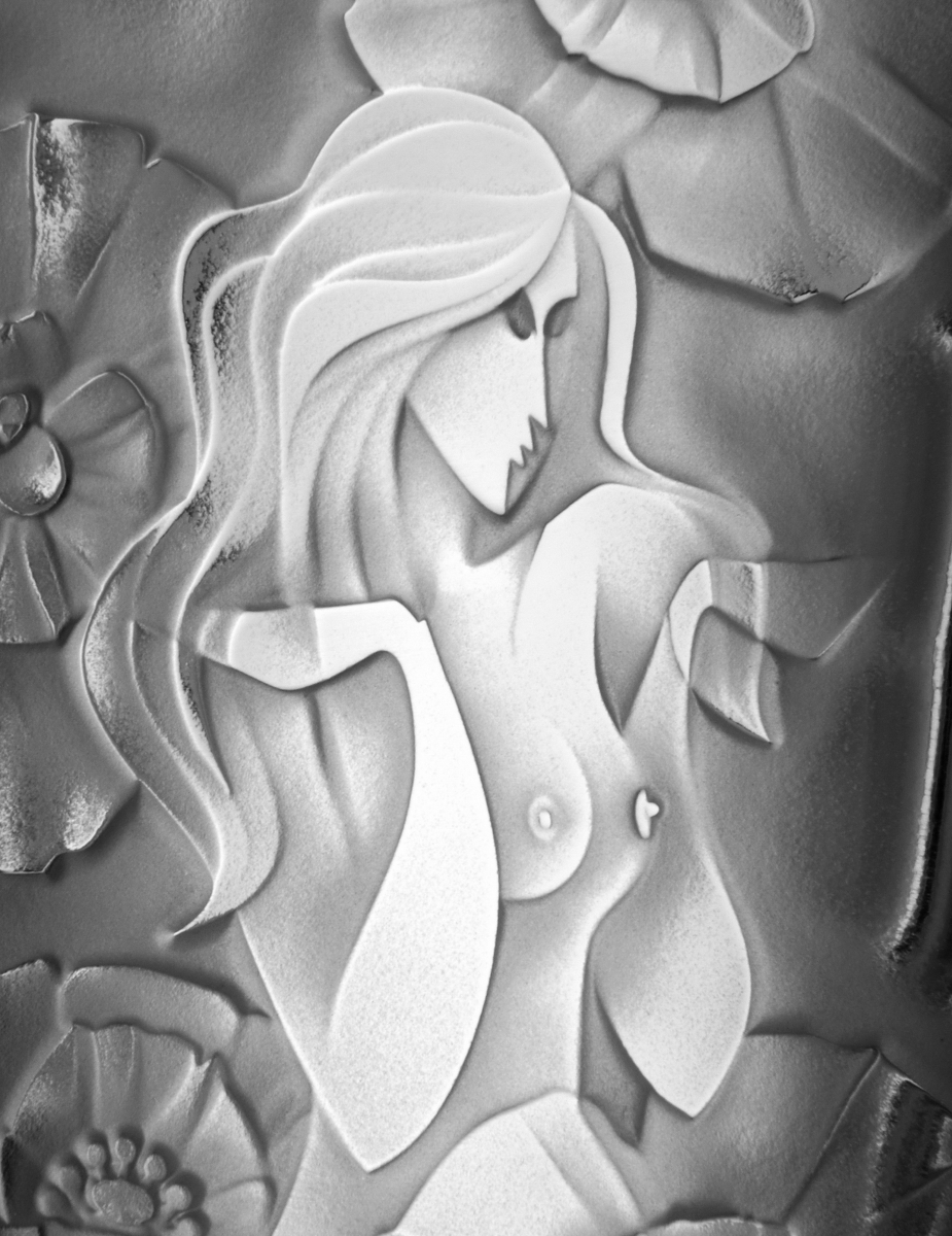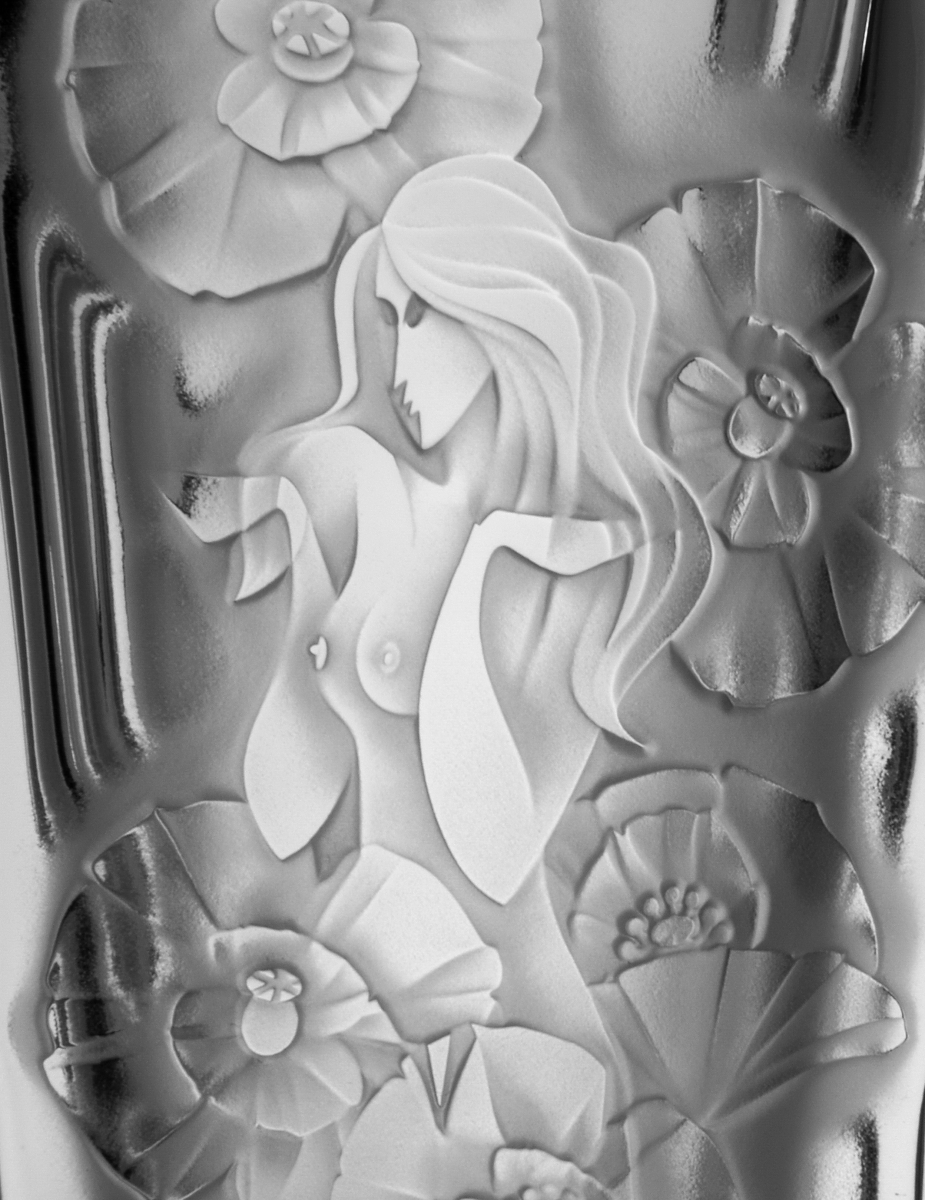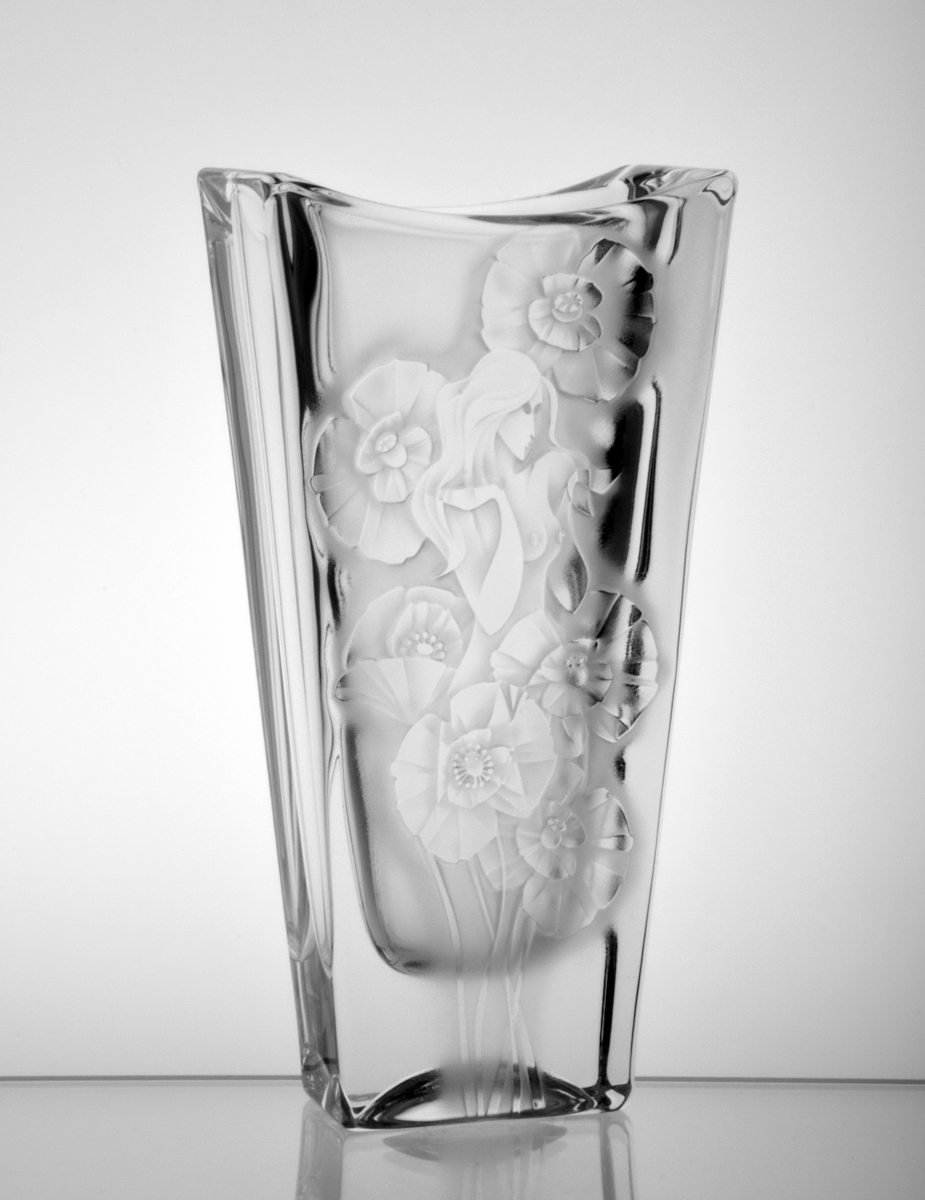 Clear crystal vase decorated with stylized poppies flower and fairytale woman. Hand-made, sandblasted and polished decoration. Bohemai crystalite, limited series.