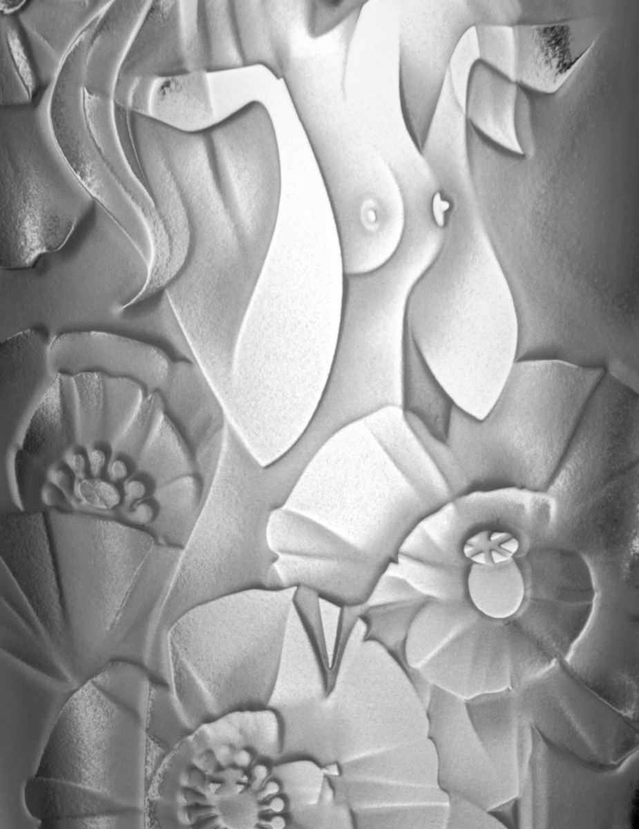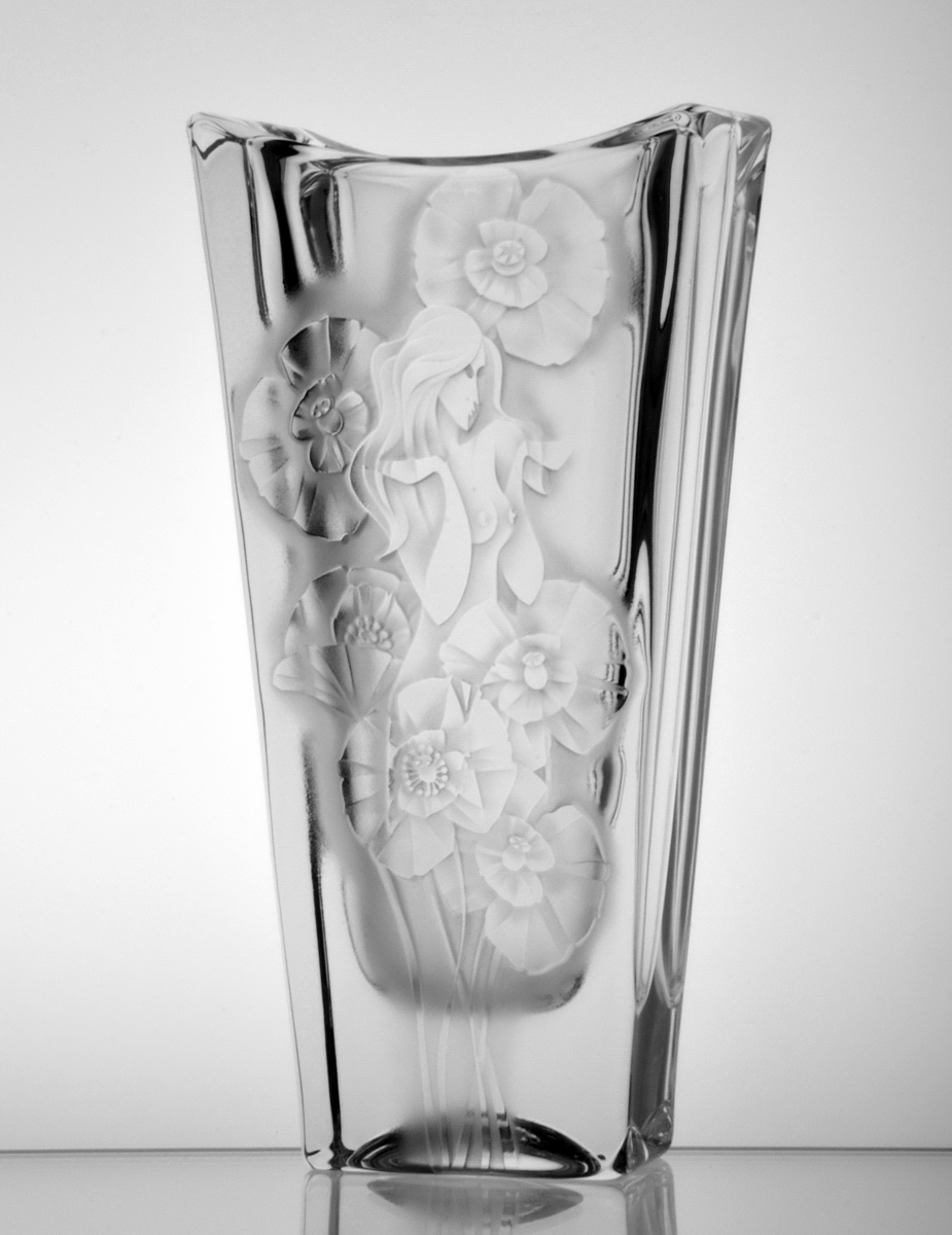 Clear crystal vase decorated with stylized poppies flower and fairytale woman. Hand-made, sandblasted and polished decoration. Bohemai crystalite, limited series.